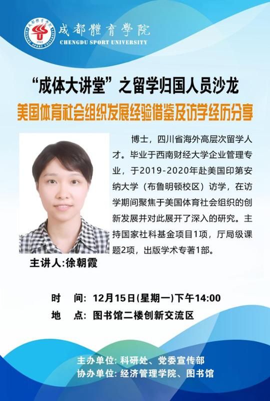 学校将于2025年12月15日(周一)下午14:00在图书馆2楼创新交流区举行“成体大讲堂”科研讲座系列活动之留学归国人员沙龙。本次讲座特邀经济管理学院徐朝霞副教授主讲。题目为:《美国体育社会组织发展经验借鉴及访学经历分享》。欢迎全校师生积极参加。