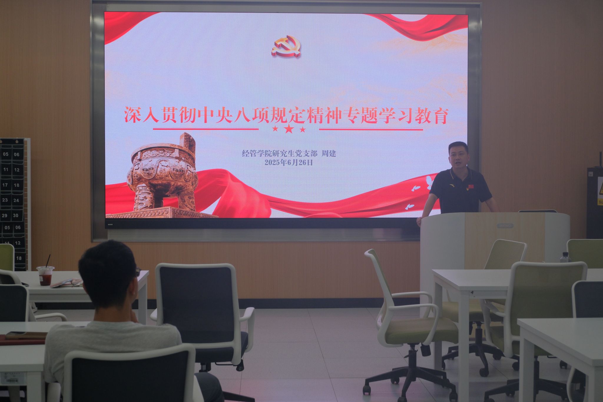 周建结合党支部研究生们的学习、科研、生活等方面开展党课的讲授,要求全体党员在七一来临之际发挥党员先锋模范作用,严格落实中央八项规定精神,争做一名合格且优秀的中共党员。