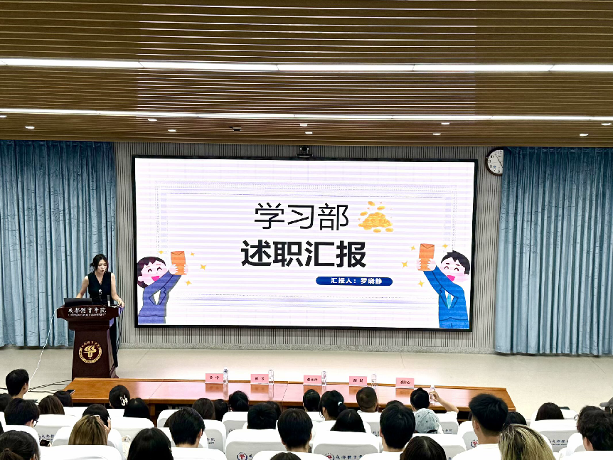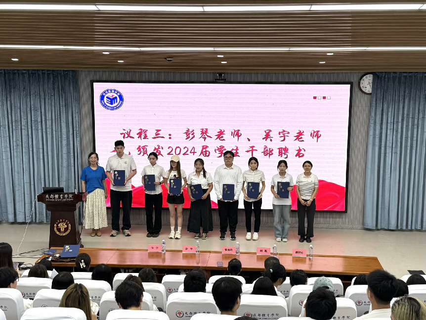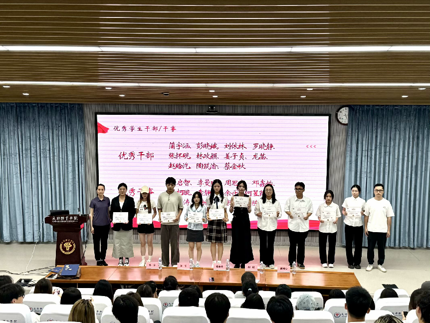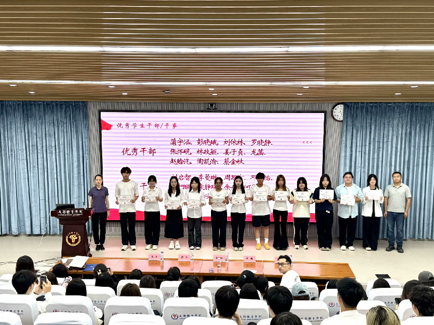 大会首先由学生会主席蒲宇涵作年度工作汇报,全面总结一学年来的党团工作成果。随后,各部门依次进行工总结,公布年度考核合格成员名单。接下来,张林玲书记和学管办老师依次为上届学生干部颁发聘书,公布新一届学生干部名单并为评优成员颁发奖状。上届学生干部代表发表了工作感言。