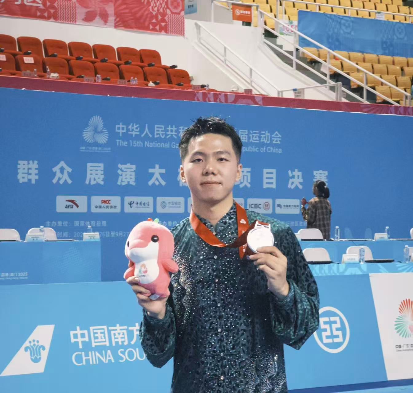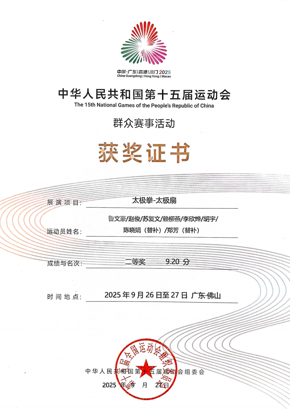 9月27日,在广东佛山高明体育中心举办的第十五届全运会群众展演太极拳项目决赛中,经济管理学院学生苏复文与学校其他队友组成的代表队在太极扇项目中以9.20分的优异成绩斩获全国亚军。
