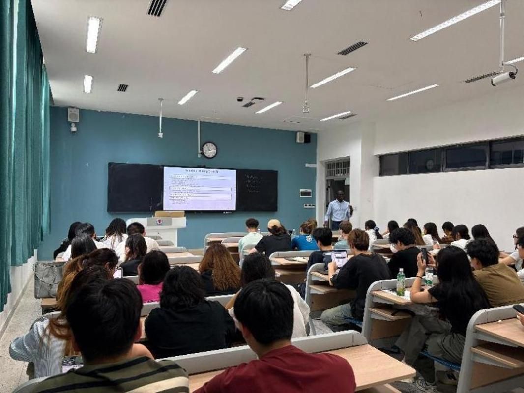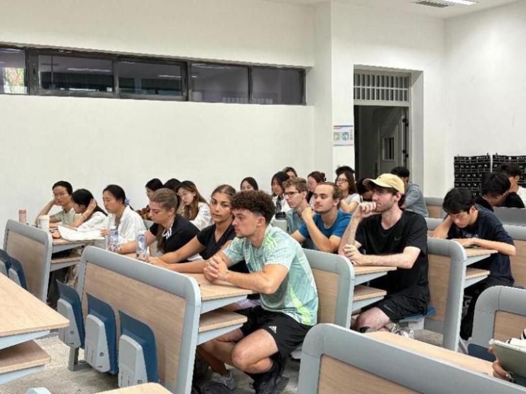 5月23日上午,法国洛林大学师生代表到我校访问,并来到经济管理学院2024级体育经济与管理(中外合作办学)专业外教课堂开展交流。