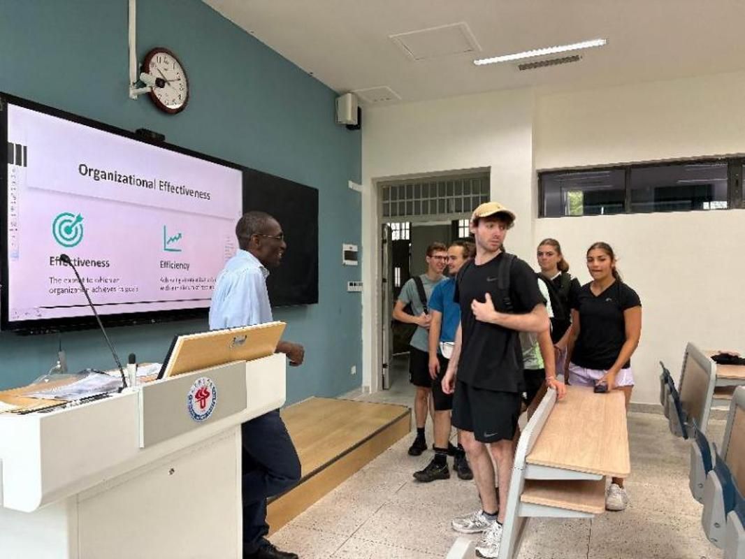 洛林大学师生与我院学生一起学习了外教老师Gerard Adedjoumon Akindes《体育管理的原理与应用》课程内容,感受了课堂氛围和教学环境。随后,两校师生就课程相关知识展开交流,双方在问答中碰撞出新的思考。洛林大学师生还了解了我院的办学情况和其他课程内容,同时向我方介绍了洛林大学的校园环境和课程体系。