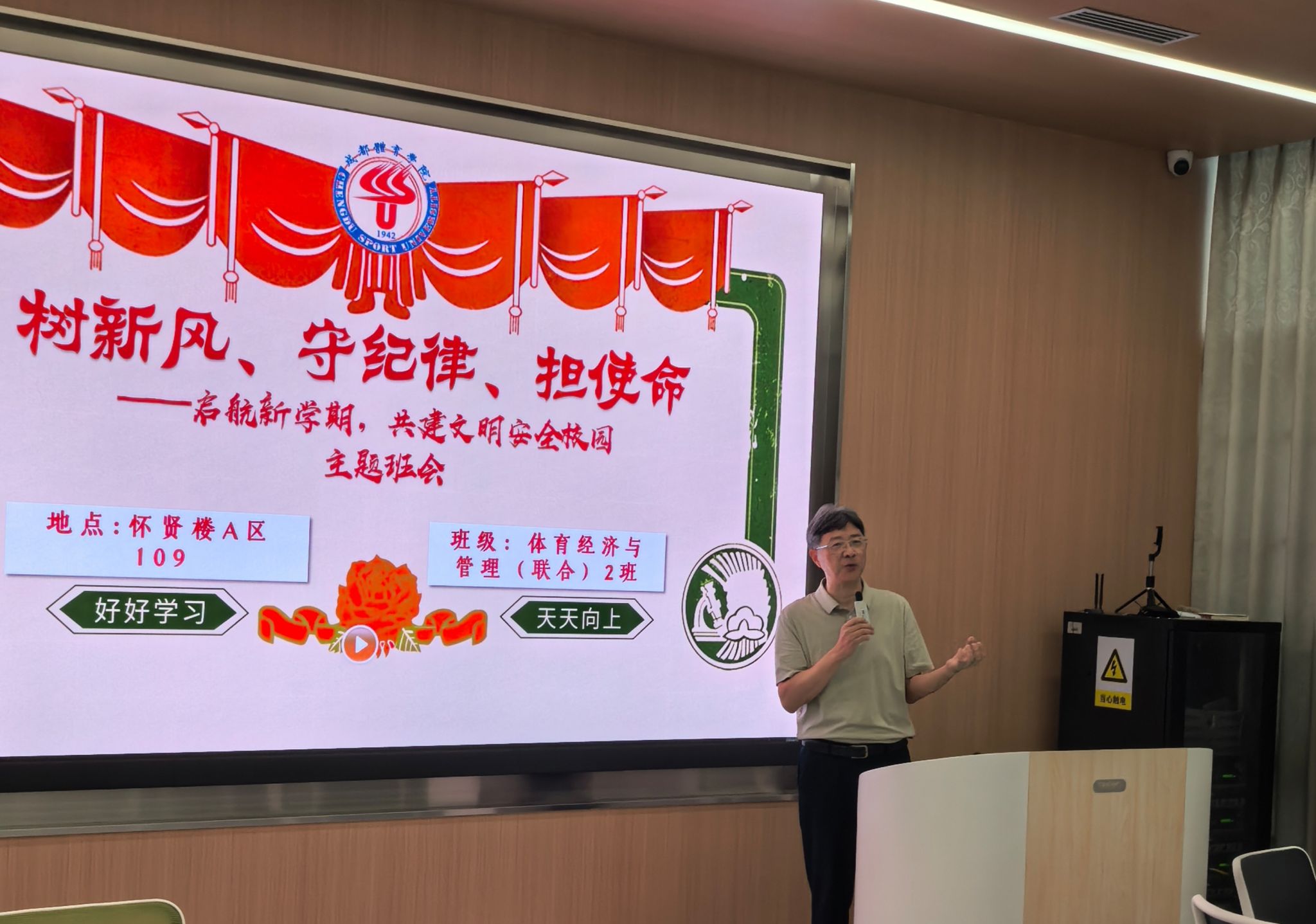 为全面贯彻落实立德树人根本任务,扎实推进学生行为养成教育。2025年9月18日上午,2023级体育经济管理(中外联合)二班在怀贤楼A109召开9月主题班会。学校党委常委、副校长李林作为班级的校级领导联系人参加,学院党委书记张林玲参加,班主任周建主持。