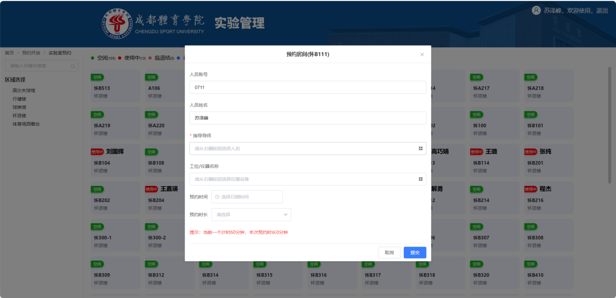 5. 填写指导老师,预约时间,预约时长,点击提交